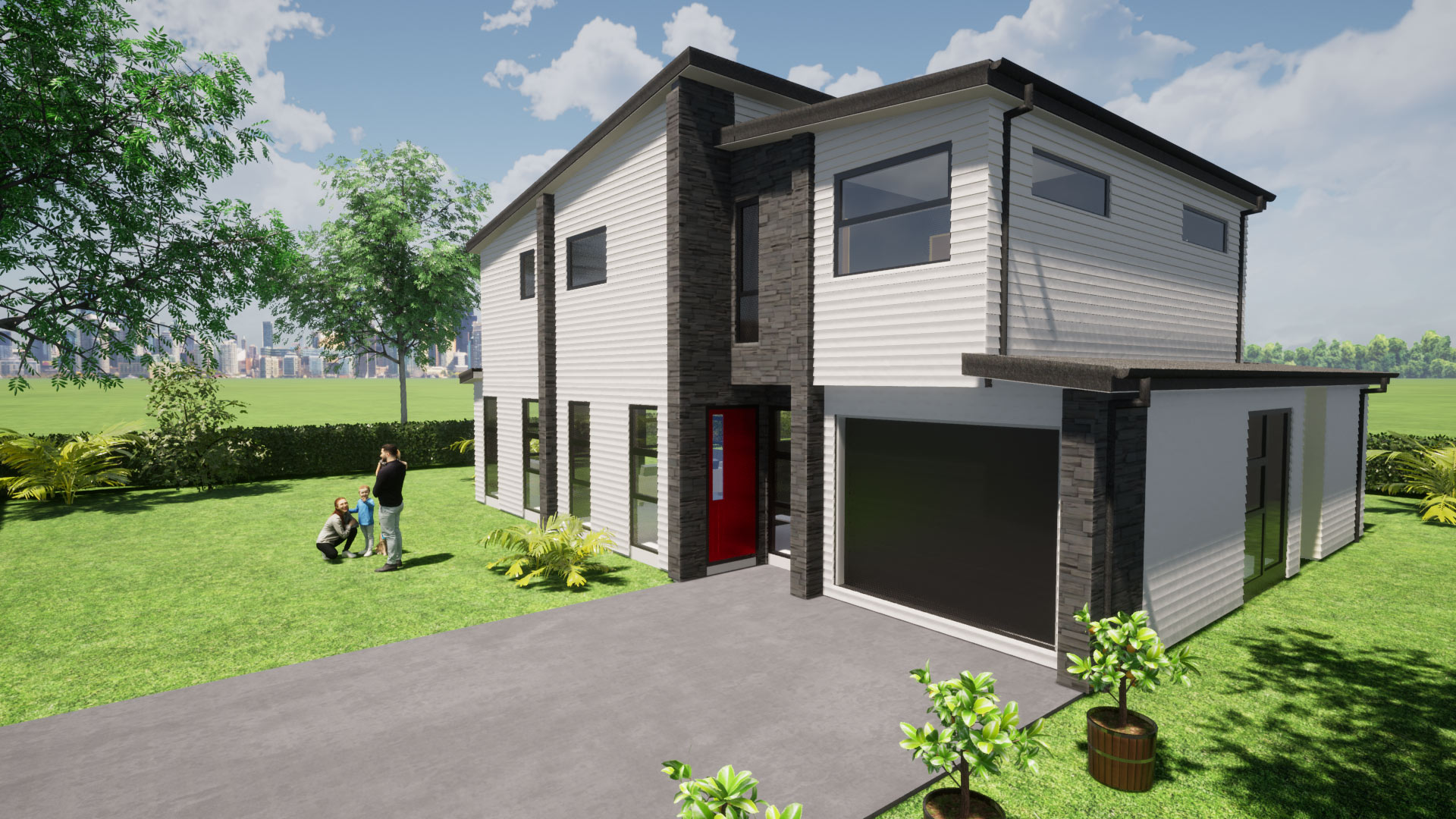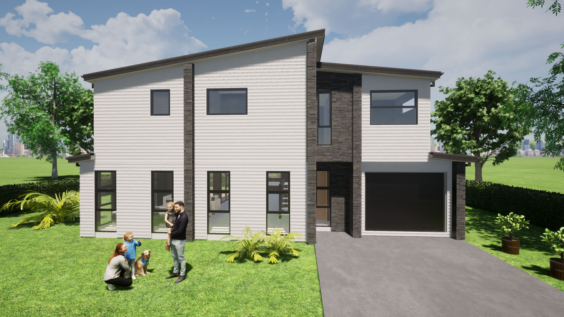 Design Purpose: Private development and Private Living in St Heliers This contemporary house stands out from typical inner city housing solutions. It has a unique design that meets the growing demand for modern homes in the beautiful area of St Heliers. The combination of metal vertical cladding, brick, and horizontal weatherboard cladding, along with large joinery openings, create an elegant structure. The design includes 2 master bedrooms with ensuites, 2 double bedrooms, and an open concept living/dining area on the first floor, offering stunning views of St Heliers bay and Rangitoto. The double garage has EV power connections, keeping up with today's technology.
